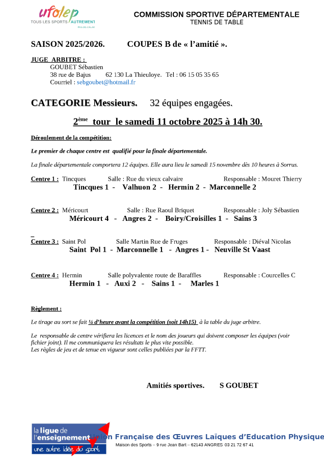 Les 27 et 28 avril 2024 auront lieu les Nationaux B Tennis de Table UFOLEP 2024 à l'Espace Ladoumègue, rue Jeannette Prin à Méricourt.
