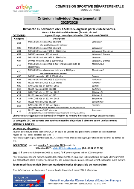 Les 27 et 28 avril 2024 auront lieu les Nationaux B Tennis de Table UFOLEP 2024 à l'Espace Ladoumègue, rue Jeannette Prin à Méricourt.